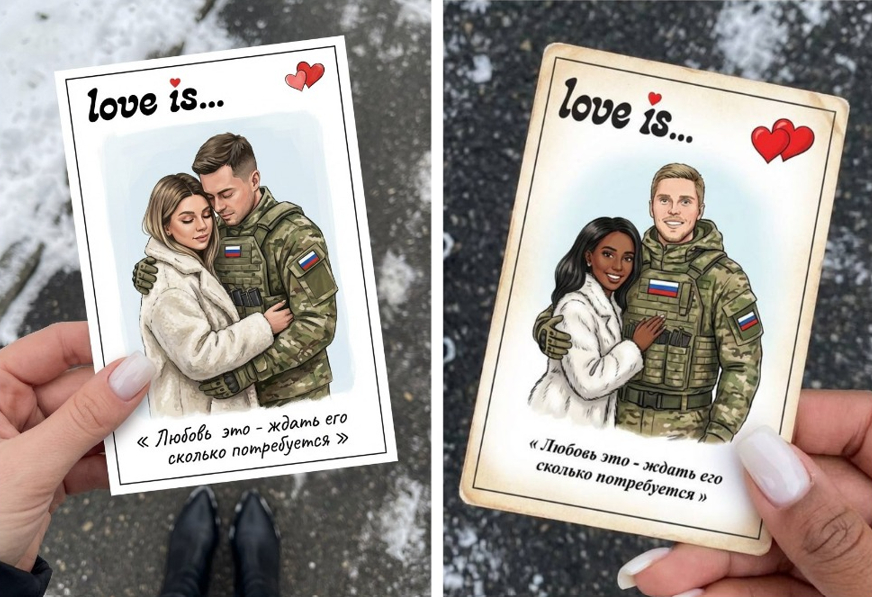 Стилизованная карточка в духе вкладышей «Love is...». На изображении молодая пара: мужчина в современной российской военной форме (цвета мультикам)и бронежелете, на котором нашивка с флагом России, рядом красивая девушка в белом пальто шубе. Девушка нежно обнимает мужчину за плечо. Карточка имеет характерную рамку, сверху расположена надпись «love is...» с маленьким красным сердечком над буквой «i», а в углу — два красных сердца. В нижней части карточки на белом фоне напечатан глубокий текст на русском языке: « Любовь это - ждать его сколько потребуется ». Персонажи на карточке в живописном стиле с приложенных фотографий. Детальный снимок от первого лица (POV) с высоким углом, показывающий ноги человека в изящных черных сапогах с длинным узким носом, на фоне асфальта. Поверхность - темный асфальт, припорошенный слоем снега . Рука с молочным маникюром квадратной формы.
