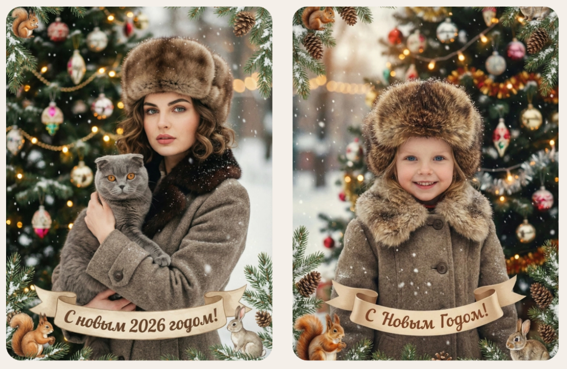 Стиль - советские сказочные открытки 1950-1970-х годов, мягкая живописная иллюстрация, ощущение тепла и уюта.Композиция и формат:Вертикальный формат 9:16 Персонажи остаются в центре композиции Фон - зимняя сказочная атмосфера Лица: Лица сохранить максимально похожими на оригинальную. фотографию (one-to-one likeness) Без изменения черт лица, возраста и эмоций. Реалистичное сходство, аккуратная художественная стилизация без искажений. Одежда и образы: Заменить современную одежду на старинную зимнюю советскую одежду Декор и детали: Новогодняя ёлка с простыми советскими игрушками Еловые шишки, хвойные ветки Цвет и атмосфера: Светлая, зимняя, мягкая цветовая палитра Пастельные оттенки, эффект старой бумаги, легкое зерно Сказочное, теплое новогоднее настроение Надпись: Текст: «С Новым годом!» Шрифт - изящный, рукописный, сказочный, в стиле советских открыток