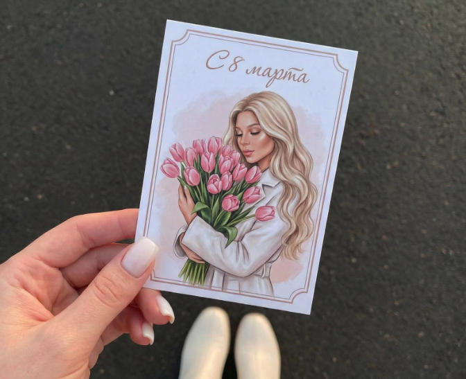 Стилизованная карточка в духе нежной мини открытки. На изображении молодая красивая девушка в белом пальто. Девушка нежно обнимает букет розовых тюльпанов. Карточка имеет характерную рамку, сверху расположена надпись «С 8 марта». Персонаж на карточке в живописном стиле с приложенного фото. Волосы распущены, естественная волна. Нюдовый макияж. Мягкий дневной свет. Детальный снимок от первого лица (POV) с высоким углом, показывающий ноги человека в изящных белых сапогах, на фоне асфальта. Поверхность - темный асфальт . Рука с молочным маникюром квадратной формы