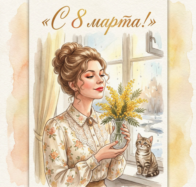 Используй лицо девушки с загруженного фото. Сохранить внешность девушки с референса без изменений — лицо полностью узнаваемое, фотореалистичное. Создать нежную весеннюю открытку в стиле советских акварельных иллюстраций 1950-х годов. Вертикальный формат 9:16, качество 8K RAW, текстура торшонированной бумаги, легкие акварельные разводы по краям. В верхней части открытки надпись изящным каллиграфическим шрифтом с завитками, охра с золотым отливом: «С 8 марта!». Образ: Девушка с русыми волнистыми волосами, собранными в высокую прическу с локонами у висков. На ней нарядная блуза цвета слоновой кости с мелким цветочным рисунком и брошью у ворота. Макияж: естественный, персиковые тени, губы цвета спелой земляники (#C94A4A). Поза: Девушка стоит у приоткрытого окна, держа в руках маленькую хрустальную вазочку с веточкой пушистой мимозы. Она вдыхает аромат весны, глаза полуприкрыты, на губах мечтательная улыбка. Фон: Комната, на подоконнике сидит полосатый котенок, за окном — тает снег, видна капель. Освещение: Мягкий утренний свет из окна. Детали: проработаны капли воды на стекле, текстура мимозы, кружево на блузе. Цветовая гамма: охра, золото, бледно-желтый, слоновая кость.
