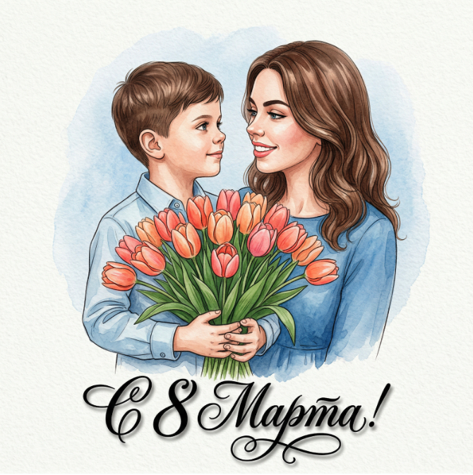Создайте иллюстрацию: портрет ребёнка и мамы (до груди) в центре кадра, волосы ухоженые, видны уши; он одет в нежно-голубую рубашку. Ребёнок держит перед грудью крупный плотный букет тюльпанов оранжево‑розовой и нежно-оранжевой гаммы с живыми зелёными листьями, маленькие руки крепко охватывают стебли. Мальчик расположен полубогом к кадру, мама стоит перед ним так же полубогом к кадру, смотрит на ребёнка и мило улыбается, у мамы платье синего цвета и распущены волнистые волосы, мальчик смотрит на маму. Фон — мягкий белый холст с едва ощутимым акварельным голубым ореолом вокруг фигуры. Внизу крупная чёрная каллиграфическая подпись «С 8 Марта!» с изящными завитками и лёгкой тенью. Стиль — детальная акварельная иллюстрация: тонкая линия, реалистичная фактура бумаги, мягкие тени, тёплая праздничная атмосфера, высокая детализация цветков и прядей, симметричная и спокойная композиция, мягкое рассеянное освещение.