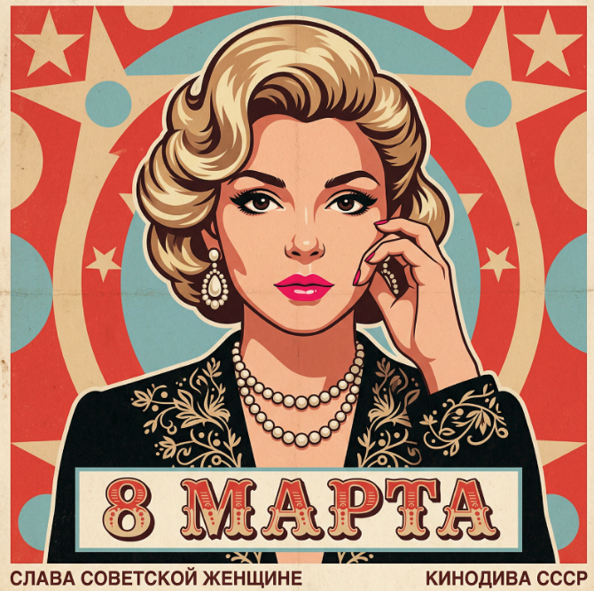 Коллекционная открытка в стиле советского гламура 1950-х годов, портрет кинодивы СССР, выразительные глаза, аккуратная причёска, элегантные украшения, стиль кинопостера, строгая симметричная композиция, геометрический фон, красно-бежево-голубая палитра, плоская графика, винтажная кириллица, надпись «8 Марта», эстетика музейной советской полиграфии