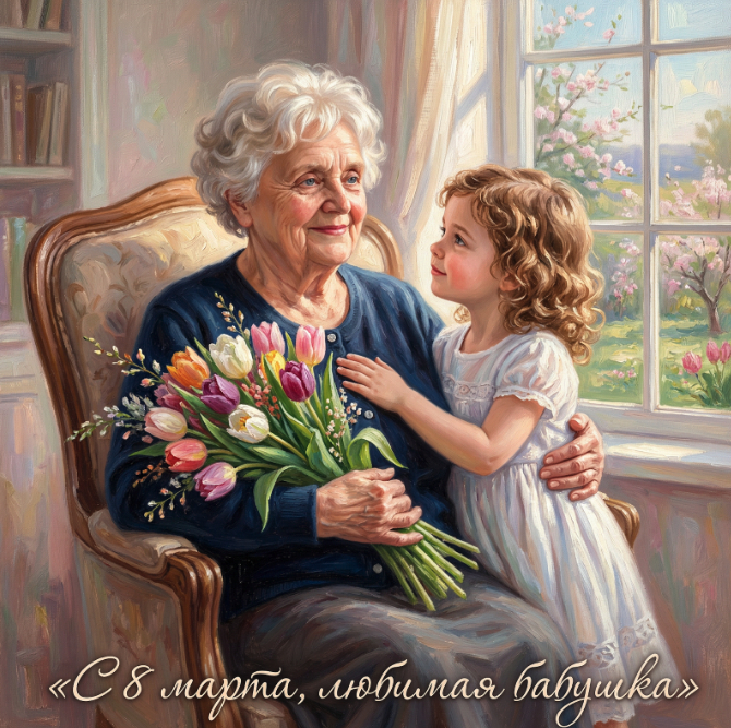Создай портрет, не меняя черты лица. Нежная масляная картина, пожилая женщина с мягкой улыбкой сидит в кресле, держит букет тюльпанов, маленькая внучка обнимает её, девочка в белом легком платье. теплый солнечный свет, пастельный фон,окно с весенним пейзажем, реалистичная живопись, внизу надпись «С 8 марта, любимая бабушка», ultra detailed, oil texture, 4k