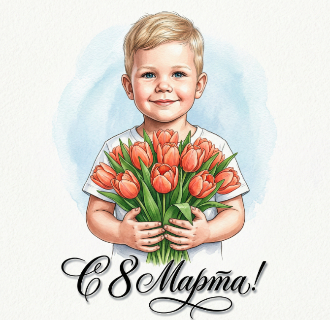 Вертикальная портретная иллюстрация 9:16, центрированный кадр, верхняя часть туловища ребёнка спереди. Мальчик одет в белую футболку. Ребенок держит крупный плотный букет тюльпанов оранжево-розового цвета, плотные лепестки, свежие зелёные листья, букет расположен прямо перед грудью, кисти рук маленькие обхватывают стебли. На фоне мягкий белый фон с лёгким акварельным голубым ореолом вокруг ребенка. Внизу композиции крупная черного цвета каллиграфическая подпись С 8 Марта! с изящными завитками и тенью. Стиль — детальная акварельная/ иллюстративная живопись, мягкие тени, тонкая линия, реалистичная текстура бумаги, тёплая праздничная атмосфера, высокая детализация цветов и волос, симметричная композиция, мягкое рассеянное освещение.