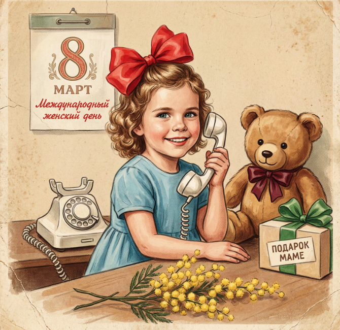 Винтажная иллюстрация в стиле советской открытки 1950-х годов: девочка 3 лет в простом светло-голубом платье с крупным ярко-красным бантом в волосах, сидящая за столом. Она держит в руке белую трубку старинного телефонного аппарата; рядом на столе — дисковый телефон. Справа от девочки стоит плюшевый мишка с бантом у шеи и подарочная коробка с зелёной лентой, на коробке четко читается надпись на русском: «ПОДАРОК МАМЕ». На стене позади — лист календаря с крупной цифрой «8 МАРТ» и надписью курсивом «Международный женский день». На переднем плане — веточки мимозы с желтыми пушистыми соцветиями. Композиция — портретная, кадр по пояс, персонажи и предметы центрированы, фотографический ракурс слегка сверху. Стиль исполнения: ручная живопись (акварель с элементами гуаши и пастели), мягкие кистевые штрихи, тонкая зернистая фактура бумаги, приглушенная тепловая палитра (кремовые, бежевые и охристые тона фона), акцентные цвета — голубой платья, красный бант, желтая мимоза. Лёгкая виньетка по краям, имитация старой бумаги с потёртостями, трещинками и пожелтением, чуть приглушенные контуры, мягкие тени, ровное рассеянное освещение, атмосфера ностальгии и сентиментальности. Детали и типографика: каллиграфическая рукописная надпись «Международный женский день» курсивом красным цветом; цифра «8» крупная, в декоративном ретро-шрифте. Надпись на коробке — строгими заглавными буквами. Добавить слегка потертые края и узоры старой печати.