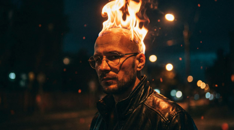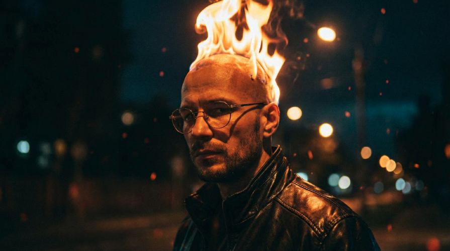 USE MY PHOTO TO CREATE A DRAMATIC CINEMATIC PORTRAIT AT NIGHT, WITH REALISTIC LIGHTING AND TEXTURE. THE PERSON'S HEAD APPEARS TO HAVE FLAMES RISING FROM THE TOP LIKE A FIERY MOHAWK, GLOWING WARMLY AGAINST A DARK, MOODY BACKGROUND. EMPHASIZE THE DETAILED SKIN TEXTURE, LEATHER JACKET SHINE, AND SOFT BOKE LIGHTS BEHIND. KEEP THE OVERALL TONE GRITTY AND INTENSE, WITH REALISTIC FIRE AND DEEP CONTRAST.