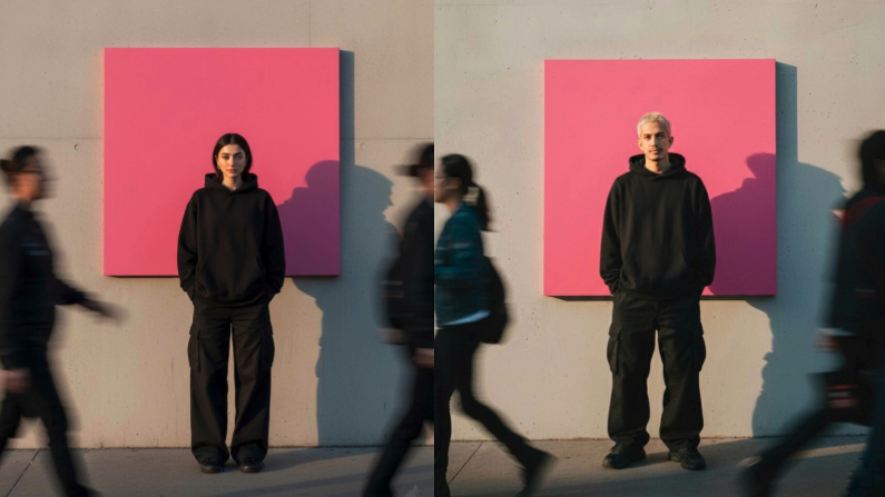 REALISTIC STREET PHOTO OF ME (USE MY FACE) STANDING IN FRONT OF A SMOOTH CONCRETE WALL WITH A LARGE BRIGHT PINK ART PANEL BEHIND. GOLDEN-HOUR LIGHT, SOFT SHADOWS, MINIMALIST AND CINEMATIC STYLE. I WEAR A BLACK HOODIE, BLACK CARGO PANTS, BLACK SNEAKERS, HANDS IN POCKETS, CALM EXPRESSION. A FEW PEOPLE IN MOTION BLUR PASS BY IN THE FOREGROUND. 50MM LENS, F/1.8, SHALLOW DEPTH OF FIELD, EDITORIAL STREET PHOTOGRAPHY LOOK.