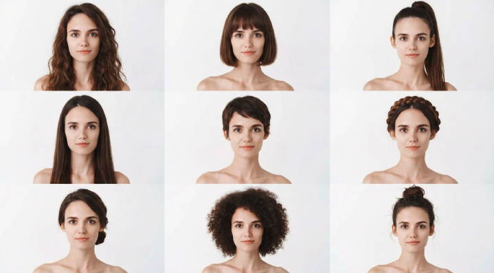 Покажи этого персонажа (приложенное фото) с 9 разными причёсками (сетка 3×3).