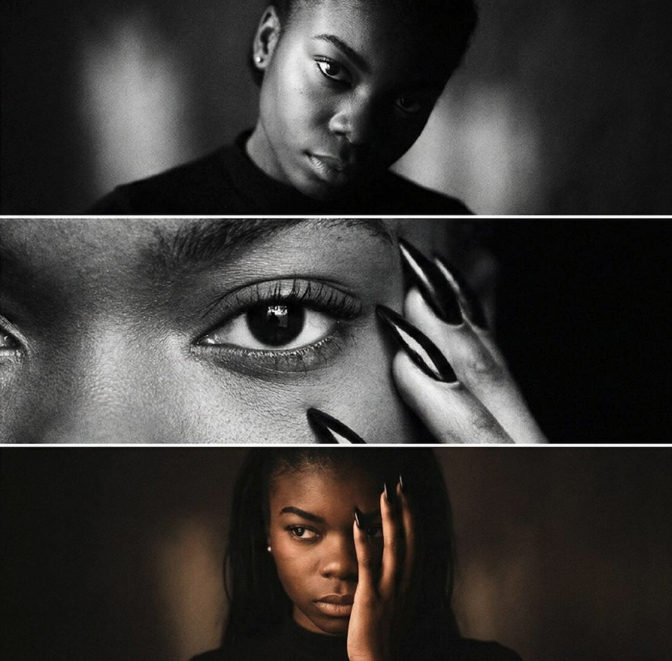 Не меняй черты лица. Создай фото из трех картинок. Верхняя картинка: Девушка смотрит в камеру с лёгким наклоном головы, её лицо частично скрыто тенью, но взгляд остаётся глубоким и интригующим. Один глаз освещён, создавая контраст с тенью на другом, что придаёт изображению атмосферу таинственности и напряжения. Она носит чёрную одежду, которая создаёт контраст с её кожей, добавляя строгости и драматизма. Фон: Тёмный, с мягким освещением, которое подчеркивает её лицо и создаёт ощущения глубины. Центральная картинка (Глаз): Крупный план её глаза, в котором каждый элемент — от ресниц до радужки — виден с предельной чёткостью. Её взгляд сосредоточен, прямой, создавая ощущение сильного внутреннего мира. Одежда чёрная, её маникюр — черный острые, создавая лёгкий акцент на её руках, которые не слишком заметны на фоне её строгого и яркого взгляда. Фон: Чёрный, с мягкими тенями, фокус на глазе и контрасте с окружением. Нижняя картинка: Девушка стоит, прикрывая часть лица рукой, её взгляд направлен в сторону, но остаётся интенсивным, словно что-то скрывающееся внутри неё. Она носит чёрную одежду, и её руки с черным острым маникюром прикрывают её лицо. Этот жест добавляет кадру загадочности и интимности. Освещение мягкое и тёплое, создавая игру теней на её лице и теле. Фон: Тёмный, что придаёт кадру контрастность, акцентируя внимание на её лице и жестах. Для усиления атмосферы добавлена зернистость, что придаёт кадрам винтажный эффект, усиливающий драматизм и глубину. –ar 3:4 –style raw –мягкое освещение –зернистость.