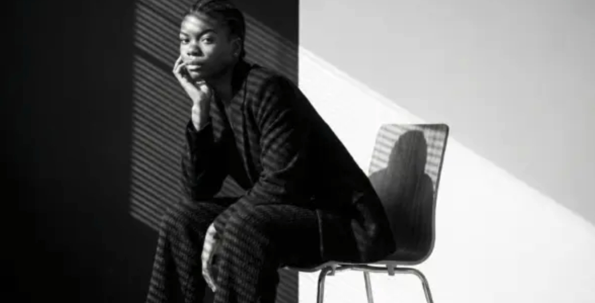 Гиперреалистичное фото в 8K качества, изображающее женщину, сидящей на стуле в фотостудии. Женщина сидит в профиль, слегка повернувшись к камере, с выражением задумчивости. Ее поза расслаблена, рука поднята к подбородку, что добавляет кадру атмосферу спокойной рефлексии. Она одета в пиджак чёрный оверсайз и брюки ткань выглядит плотной, текстурированной и мягкой. Студийный фон разделен на две половины: чёрную и белую, создавая контрастную и динамичную композицию. Свет от окна падает на женщину, создавая полосатые тени, которые перекрывают часть его тела и стул, добавляя интересную игру света и теней. Стул, на котором она сидит, современный, с металлическими ножками и деревянным сиденьем, что придает кадру стильный и минималистичный вид. Освещение мягкое, с контрастами, акцентирующими текстуры ткани и тонкости кожи, создавая гиперреалистичное изображение с высокой детализацией. Фотография чёрно-белая, что подчеркивает глубину и атмосферу сцены.