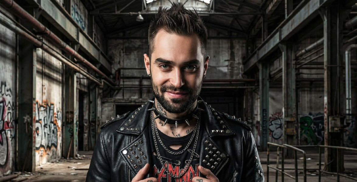 Сохрани внешность. Лицо слегка развернуто, без резкого поворота. Камера передаёт естественные пропорции лица. Образ панк, контрастный по отношению к деловому стилю: неформальная одежда, бунтарский характер, визуальные элементы панк-культуры. Выражение лица уверенное, с вызовом. Освещение контрастное. Фон индустриальный. Аватарка выглядит как радикально сменённый образ при полной сохранности лица.