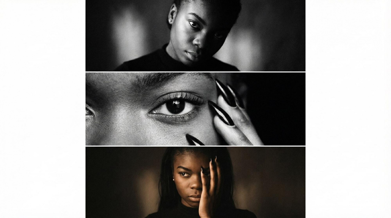 Не меняй черты лица. Создай фото из трех картинок. Верхняя картинка: Девушка смотрит в камеру с лёгким наклоном головы, её лицо частично скрыто тенью, но взгляд остаётся глубоким и интригующим. Один глаз освещён, создавая контраст с тенью на другом, что придаёт изображению атмосферу таинственности и напряжения. Она носит чёрную одежду, которая создаёт контраст с её кожей, добавляя строгости и драматизма. Фон: Тёмный, с мягким освещением, которое подчеркивает её лицо и создаёт ощущения глубины. Центральная картинка (Глаз): Крупный план её глаза, в котором каждый элемент — от ресниц до радужки — виден с предельной чёткостью. Её взгляд сосредоточен, прямой, создавая ощущение сильного внутреннего мира. Одежда чёрная, её маникюр — черный острые, создавая лёгкий акцент на её руках, которые не слишком заметны на фоне её строгого и яркого взгляда. Фон: Чёрный, с мягкими тенями, фокус на глазе и контрасте с окружением. Нижняя картинка: Девушка стоит, прикрывая часть лица рукой, её взгляд направлен в сторону, но остаётся интенсивным, словно что-то скрывающееся внутри неё. Она носит чёрную одежду, и её руки с черным острым маникюром прикрывают её лицо. Этот жест добавляет кадру загадочности и интимности. Освещение мягкое и тёплое, создавая игру теней на её лице и теле. Фон: Тёмный, что придаёт кадру контрастность, акцентируя внимание на её лице и жестах. Для усиления атмосферы добавлена зернистость, что придаёт кадрам винтажный эффект, усиливающий драматизм и глубину. –ar 3:4 –style raw –мягкое освещение –зернистость.