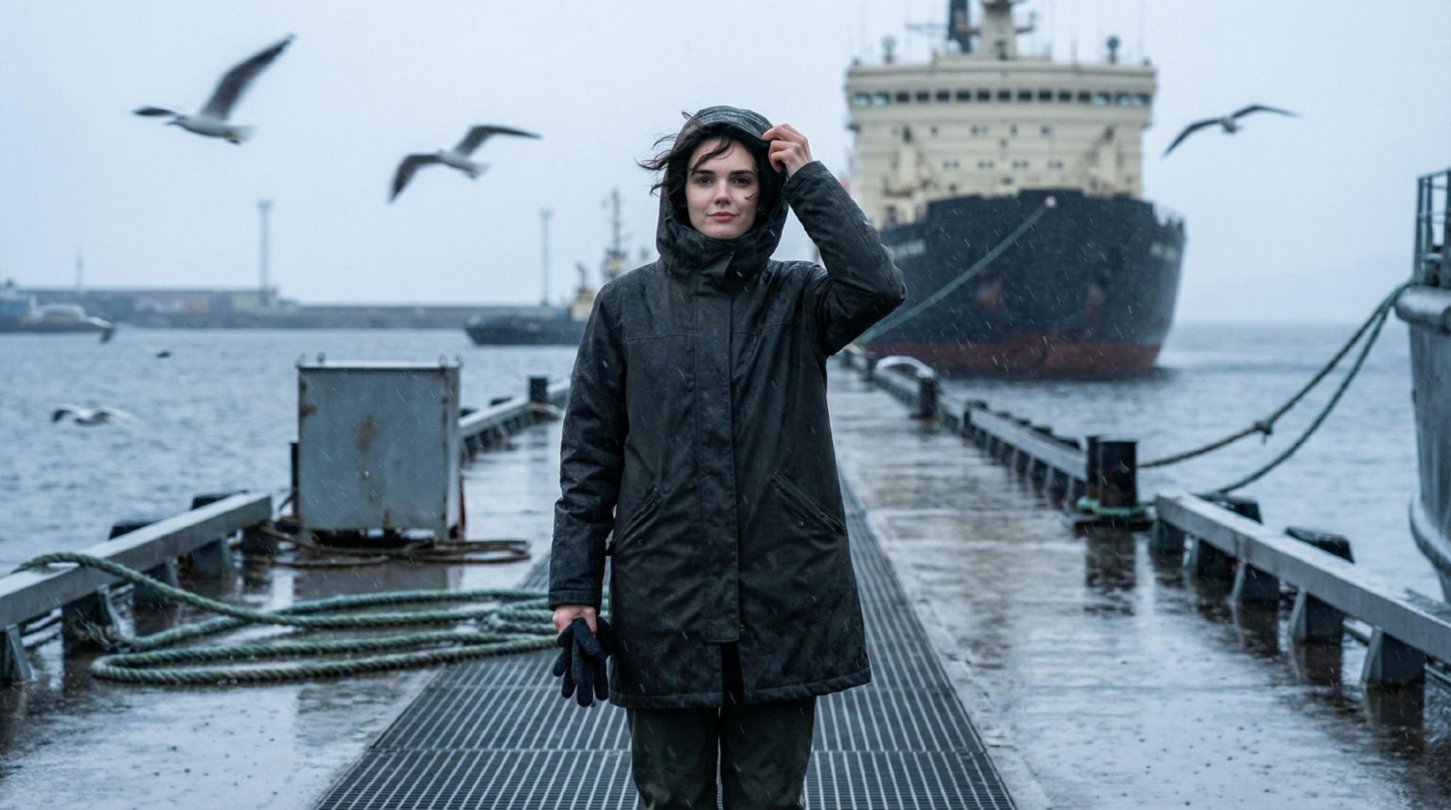 человек с референса, лицо 1 в 1. Сохрани возраст и выражение. Сцена: северный порт. Сырая погода, мелкий дождь, мокрые металлические настилы, канаты, крановые конструкции вдалеке. Над водой чайки, брызги. На заднем плане силуэт ледокола или большого судна (без названий и номеров). Герой: человек с референса стоит на причале, держит капюшон одной рукой, другой рукой сжимает перчатку или ворот. Волосы и одежда чуть треплет ветер. Взгляд в сторону воды, как будто ждёт сигнал. Одежда: плотный непромокаемый плащ или куртка, темные брюки, ботинки. Цвета холодные, без брендов. Композиция: вертикаль 4:5. Герой в нижней правой трети, слева много воздуха и мокрой фактуры причала. В верхней части несколько чаек в размытии движения. Камера: 70-100 мм, f/3.2-f/4, 1/500, ISO 800. Дождевые капли частично заморожены, фон мягкий. Негатив: читаемые номера судна, логотипы, яркое солнце, тропический вид, мультяшность, чрезмерный драматический цвет, деформация лица и рук.