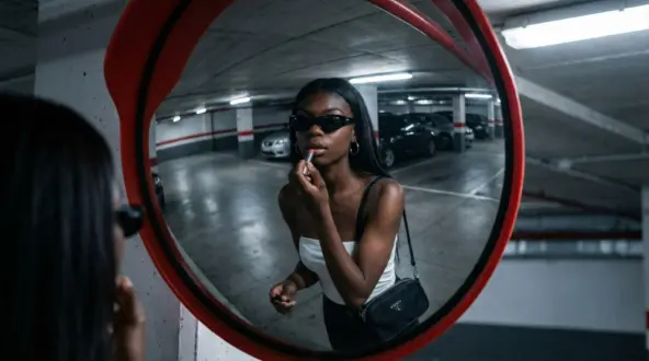Use the user’s exact appearance 1:1 — same face, skin tone, and proportions without any changes. Create a realistic urban-style photo of the user in an underground parking lot, captured through the reflection of a large convex traffic mirror with a red rim. The user, seen in the reflection, is applying lipstick while wearing sleek black sunglasses, silver hoop earrings, and a white strapless top. A small black crossbody bag hangs on one shoulder. The lighting is natural but slightly dim, with cool gray and red tones from the surroundings, giving the image an edgy, candid street-photography feel. The mood is confident and effortless, with realistic textures, lifelike shadows, and no studio or 3D look. —v 6 —ar 3:4 —style raw —q 2 —uplight —hd.