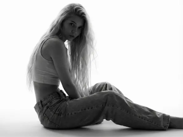 Используй лицо женщины с загруженного фото. Не изменяйте лицевую идентичность. Черно-белый монохромный художественный портрет моды, средний план. Женщина сидит на чисто белом полу перед бесшовным белым фоном. Спина и корпус напряжены, образуя изгиб и узкую талию. Прямой взгляд в камеру. Длинные волосы объемной укладки, ниспадают ниже талии и обрамляют лицо. Одежда: укороченная светлая майка без рукавов; мешковатые джинсы на бёдрах, подчёркивая контраст талии и объёма. Освещение: контровой/рин-свет позади, фон почти белый; силуэт чёткий, лицо и волосы в полутени. Настроение: минималистский гранж, с лёгким зерном, резкий фокус, глянцевое редакционное исполнение