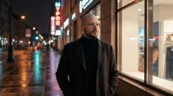 Сохрани черты лица человека на фото. Глубокий вечерний портрет с ощущением одиночества и внутренней концентрации в большом городе. СЦЕНА: человек стоит у края тротуара или возле витрины, корпус слегка в профиль, взгляд направлен вдаль, лицо собранное, без эмоций. НАРЯД: тёмное пальто, водолазка или худи, монохромный образ. ПОЗА: спокойная, статичная, руки в карманах. ФОН: ночная улица, отражения огней в стекле, лёгкий дождь или влажный асфальт. ОСВЕЩЕНИЕ: уличные фонари + отражённый неоновый свет, мягкие тени. КАМЕРА: Sony A7R V, 50mm f/1.8, ISO 800, f/2.2. СТИЛЬ: cinematic night portrait, urban realism, moody tones, 8K.