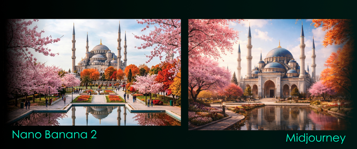 Nano Banana 2 чаще используют для редактирования фотографий и создания реалистичных изображений. В то время как Midjourney больше ориентирован на художественную генерацию иллюстраций и стилизованных сцен.