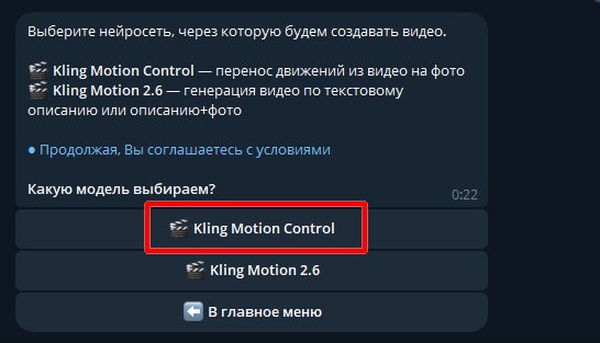 Откройте Pauk AI в Telegram → нажмите «Создать видео» → выберите Motion Control.