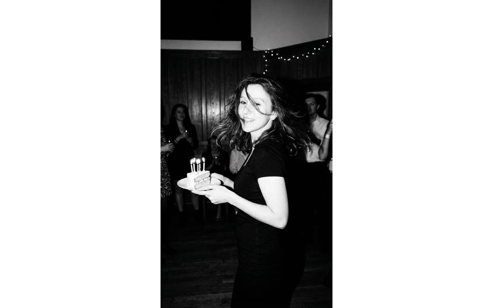 Create a photorealistic black-and-white portrait with a direct frontal flash look, high contrast and deep tonal range, cinematic and dimensional, captured like a real 90s night party photograph. The subject is standing in motion, body caught mid-step, black dress moving naturally with the gesture. Loose strands fall and shift with movement, adding spontaneity and depth without stylization. Head slightly tilted back, gaze turned to the side, expression soft and alive, as if caught between moments. Subtle motion blur enhances realism and presence. The subject holds a plate with a birthday cake, thin tall candles lit and softly glowing, creating delicate highlights and shadows. Background slightly darkened with visible wall texture and moldings, adding spatial depth. Optimized for nano-banana Pro for true photographic volume and texture. Do not alter facial identity.