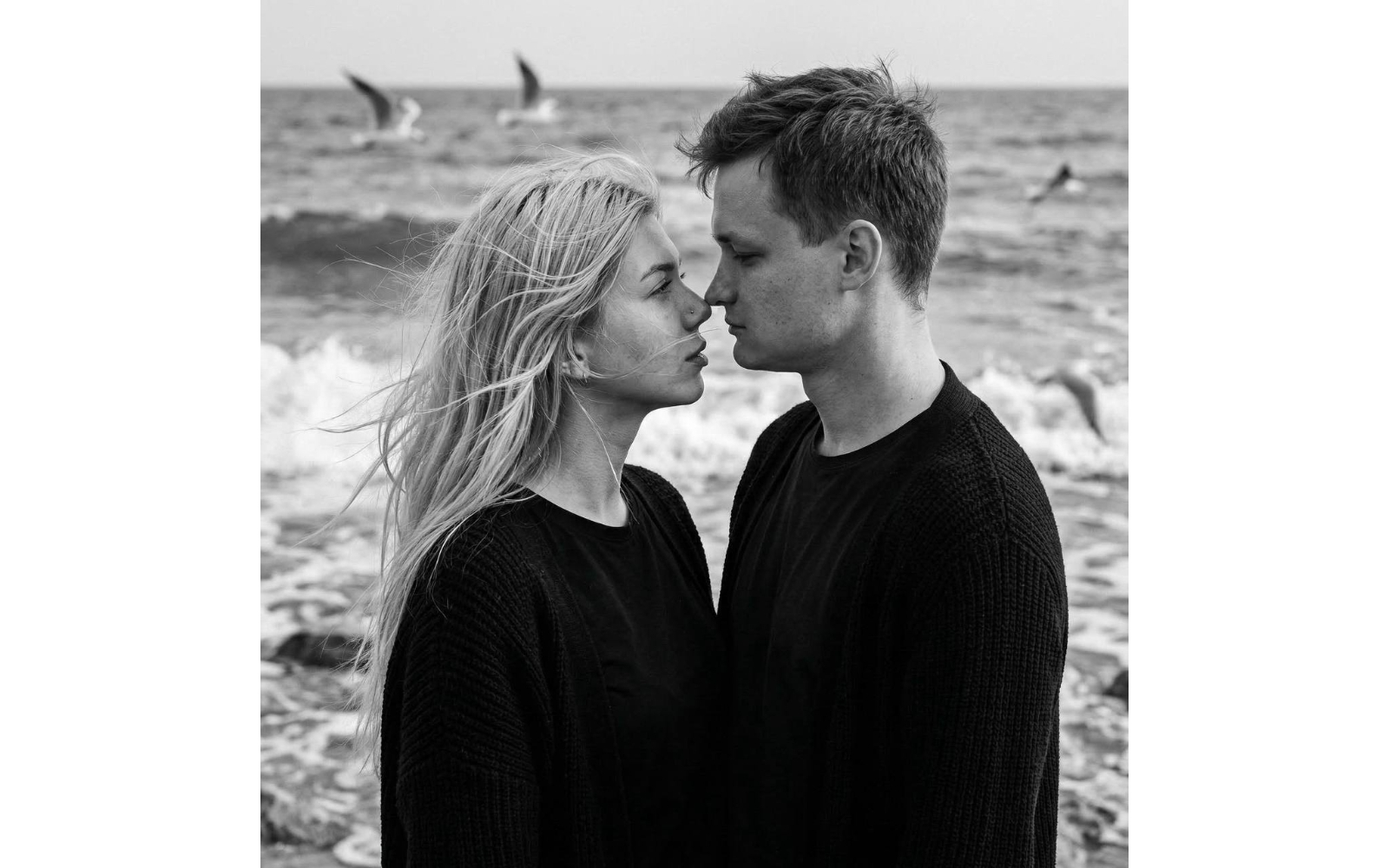 СТРОГО сохранить внешность 1:1 — лица, черты, пропорции, возраст и натуральную текстуру кожи обоих, без ретуши. Вертикальный формат 3:4. Чёрно-белый драматичный портрет по плечи у моря. Мужчина и женщина стоят вплотную друг к другу у кромки воды. Корпуса слегка развёрнуты навстречу, лица почти соприкасаются, губы на минимальном расстоянии, без поцелуя. Взгляды направлены друг другу в глаза — томные, влюблённые, мягкие. Головы немного наклонены навстречу, дыхание ощущается. Сильный морской ветер растрёпывает волосы, пряди хаотично пересекают лица, создавая динамику (движение только если волосы длинные, форма сохраняется 1:1). Одежда: на обоих чёрные базовые футболки и чёрные вязаные кардиганы, плотная матовая фактура, без деталей. Фон: волны и размытые силуэты чаек, естественная глубина резкости. Съёмка на Kodak, объектив 85mm, f/2.0. Свет мягкий рассеянный дневной, высокий контраст, выраженное зерно, матовые тени, cinematic editorial mood, высокий фотореализм,