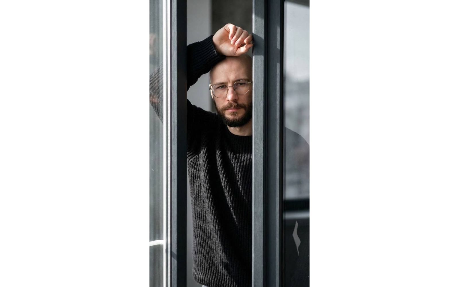 Создай портрет , не меняя черты лица. Мужчина стоит в оконном проеме, его тело частично скрыто темной рамой, левая рука поднята и покоится на верхней части оконной рамы, пальцы расслаблены на голове, голова слегка наклонена вперед, взгляд направлен прямо в камеру, портрет снят в кадре. середина его туловища была видна сквозь узкое пространство между рамами. Композиция вытянута по вертикали темными линиями окна, которые образуют жесткую геометрическую рамку. На нем угольно-черный свитер плотной вертикальной вязки. Текстура шерсти ярко выражена, ребристый узор хорошо виден при боковом освещении, материал матовый, без блеска. Оконные рамы окрашены в темно-графитовый цвет, стекла отражают мягкие блики, а фон снаружи размыт в серых и белых тонах. Место действия - интерьер у окна с естественным боковым освещением, свет падает слева направо под острым углом, создавая резкую полосу света на щеке и груди