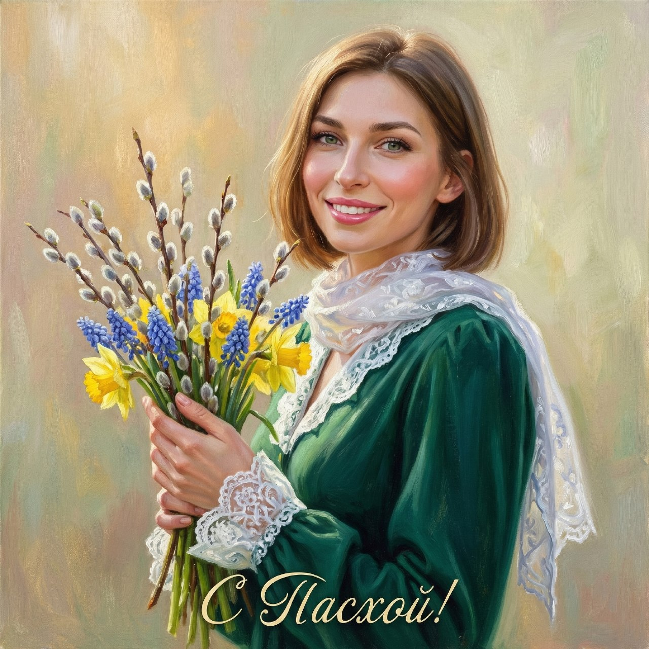 Гиперреалистичная масляная картина на холсте, написанная в стиле изысканного портрета. Женщина с референса ( на 100% сохранить черты лица, цвет глаз, цвет волос), слегка в пол оборота, смотрит прямо в камеру с мягкой, тёплой улыбкой. Композиция — по пояс, с акцентом на свет, кружево и текстуру ткани. На женщине изумрудное платье насыщенного глубокого оттенка, с длинными рукавами, кружевными манжетами и кружевным воротничком. Кружево тонкое, белоснежное, детализированное, красиво выделяется на фоне платья. На голове — белый кружевной платок, лёгкий и полупрозрачный, освещённый мягким дневным светом. Макияж нежный и аккуратный: лёгкий румянец, розовые губы с лёгким блеском, чёрные выразительные ресницы. Всё выполнено в светлой, естественной палитре. В руках — весенний букет из пушистых веточек вербы, мускари и ярких жёлтых нарциссов. Фон пастельный, размытый, с теплыми золотыми и кремово-зелёными оттенками, будто ранний весенний свет пробивается сквозь утренний воздух. Масляная текстура видна, мягкие мазки создают живописную фактуру. В нижней части картины каллиграфическая надпись: С Пасхой!.