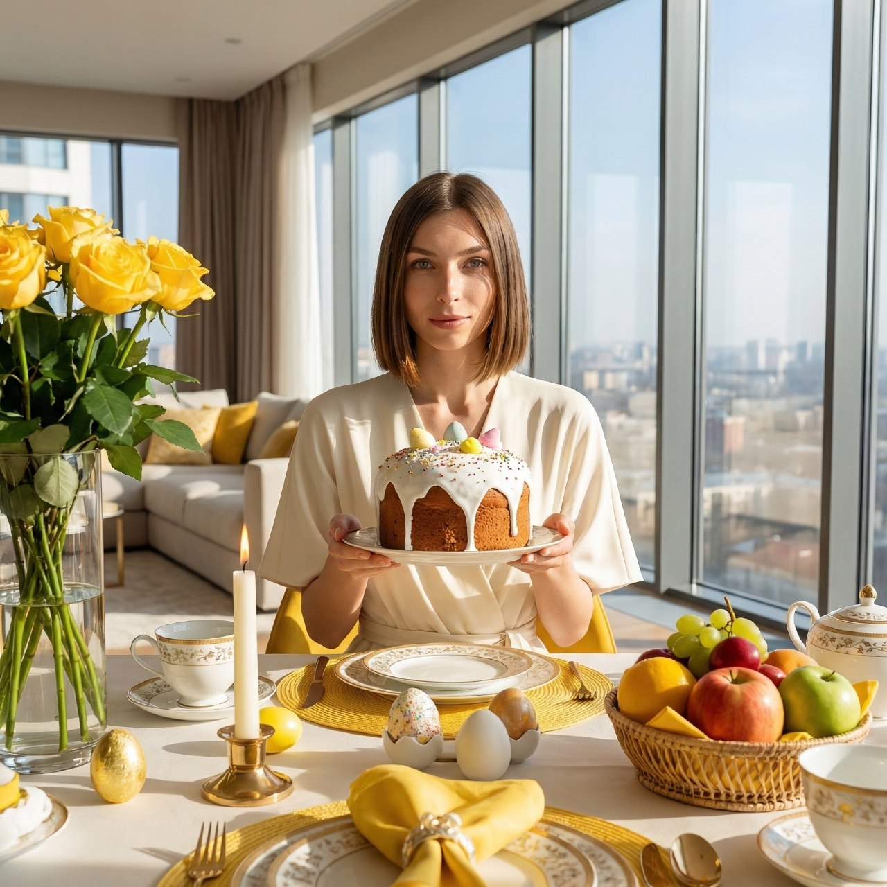 Создай элегантный пасхальный портрет молодой женщины в современном светлом интерьере с панорамными окнами. Девушка с гладким каре в кремово-белом платье сидит у празднично сервированного стола и держит на тарелке большой кулич с белой глазурью и декором. На столе — желтые и золотистые акценты, свеча, красивая посуда, корзина с фруктами и декоративными яйцами. Рядом стоит роскошный букет желтых роз в стеклянной вазе. Атмосфера стильная, солнечная, дорогая и праздничная. Стиль — luxury lifestyle, elegant editorial photography, soft daylight, refined composition, photorealistic, highly detailed, 4k.