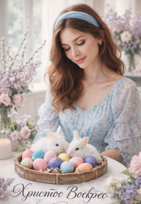 Создай нежный весенний пасхальный портрет молодой женщины в светлом интерьере, наполненном цветами. Девушка с мягкими каштановыми волосами сидит за круглым столом в воздушном голубом платье с мелким цветочным принтом и голубой повязкой на голове. Она смотрит вниз с легкой улыбкой, создавая спокойное и мечтательное настроение. На столе — деревянный лоток с яркими окрашенными пасхальными яйцами и белыми пушистыми кроликами. Вокруг много нежных сиреневых, розовых и лиловых цветов, стеклянные и керамические вазы, веточки вербы, мягкий дневной свет из большого окна. Атмосфера романтичная, уютная, весенняя, воздушная и очень эстетичная. Стиль — fine art portrait, pastel tones, soft natural light, photorealistic, highly detailed, elegant editorial, dreamy composition, 4k. Добавь элегантную каллиграфическую надпись на русском языке: «Христос Воскрес».
