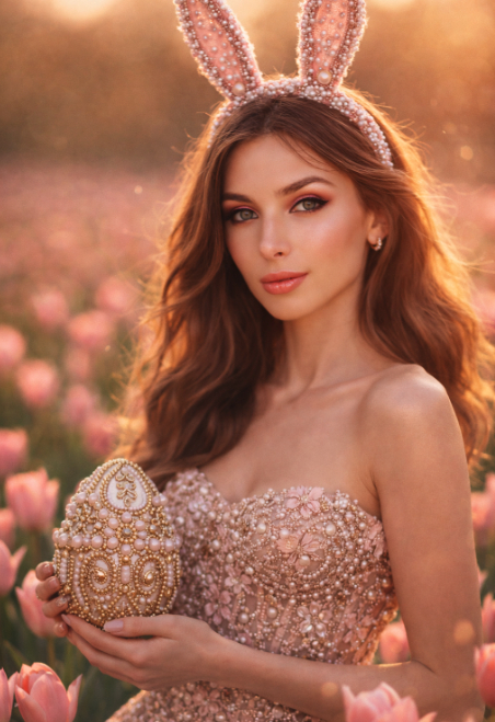 Фотореалистичный fashion‑портрет в стиле вог, vertical 9:16, девушка с референсной фотографии модно позирует в поле розовых тюльпанов, кадр по пояс/по грудь, лёгкий разворот корпуса, взгляд в камеру. Безупречный вечерний макияж, хайлайтер, естественное сияние кожи. Волосы обьемные длинные волнистые и рассыпчатые, по контуру виднеется свечение от заходящего солнца. На голове роскошный ободок с высокими розовыми кроличьими ушами, декор бисером и жемчугом. Haute couture платье/корсет, полностью расшитый жемчугом, кристаллами и цветочными аппликациями в розово‑золотой гамме, сияющая фактура. В руках большое декоративное пасхальное яйцо, расписанное золотыми узорами и жемчужными элементами. Мягкий свет, золотой час, журнальная модная съемка , пастельная цветокоррекция, dreamy mood, shallow depth of field, нежное боке, высокая детализация тканей и украшений, editorial fashion, ultra realistic. Canon EOS R5, 85 mm,