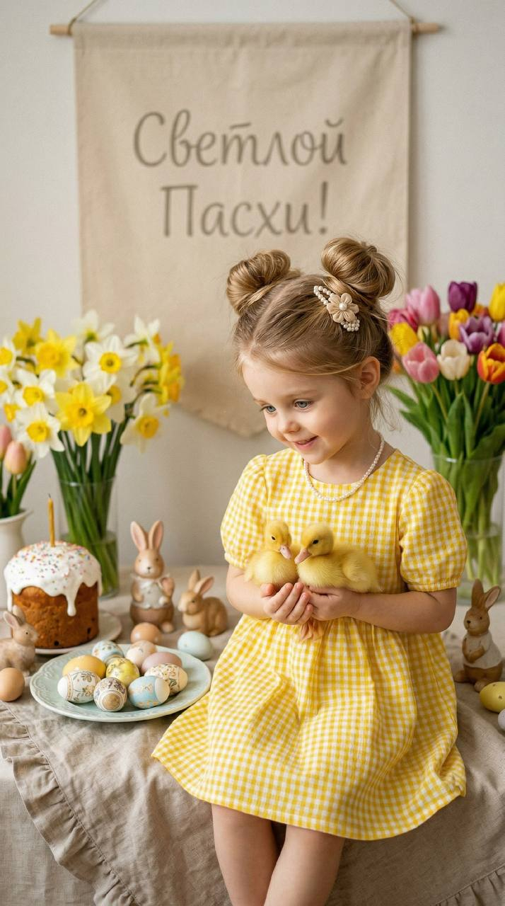 Кинематографический эффект с добавлением зерна На переднем плане маленькая девочка 6 лет в ярко\-желтом платье в клетку с рукавами\-фонариками сидит на светло\-коричневой ткани с легким рюшем\. Платье с белыми клеточками выглядит жизнерадостно, а девочка, нежно держа двух утят, слегка наклоняет голову, улыбаясь\. На её шее — светлый жемчужный браслет, а в волосах — маленькая заколка с цветочком, что придаёт ей невинный, нежный вид\. Вокруг неё весна: на заднем плане висит тканевый баннер с надписью «Светлой Пасхи\!», выполненный простым шрифтом\. По бокам композиции расположены живые цветы — нарциссы и тюльпаны в вазах, которые добавляют яркости и свежести\. На столе рядом с девочкой стоят декоративные пасхальные фигурки кроликов и яиц, а также пасхальный кулич с глазурью\. В пастельной тарелке аккуратно лежат декоративные яйца, создавая атмосферу уюта и праздника\. Всё окружение выполнено в теплых пастельных оттенках, с мягким светом, который придаёт сцене спокойствие и гармонию\. Жёлтое платье девочки и яркие тюльпаны на фоне создают контраст, привлекая внимание, а утята, ярко\-жёлтые, вносят в композицию динамичность и детскую непосредственность