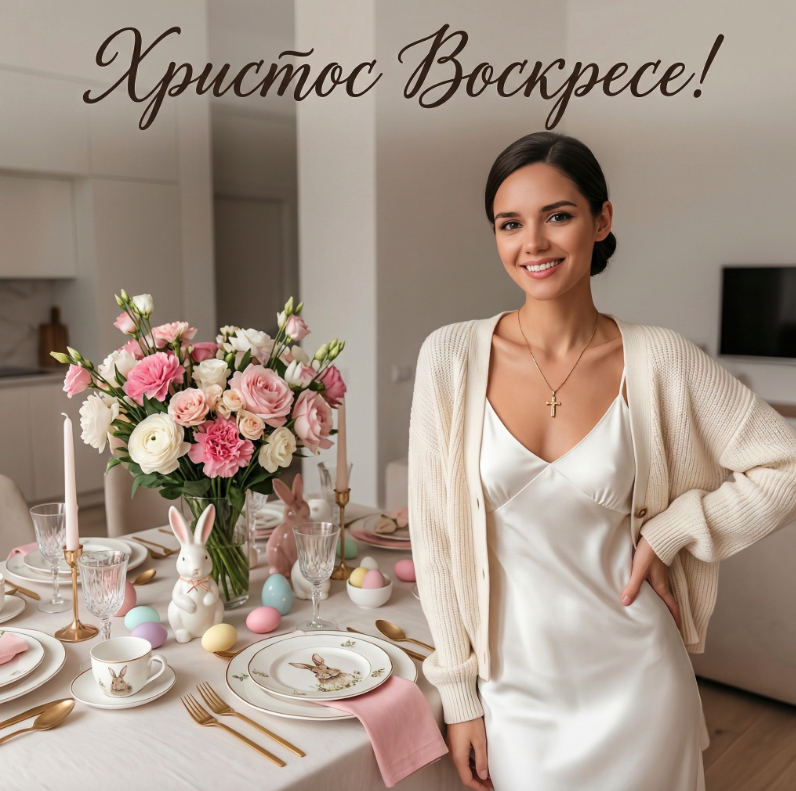 Создай красивую пасхальную сцену с молодой женщиной у праздничного стола в современном интерьере. Девушка с аккуратно собранными волосами улыбается, стоя рядом с круглым столом, сервированным к Пасхе. На ней белое атласное платье на тонких бретелях и светлый кардиган, на шее крестик. Стол украшен изысканной посудой с изображением кроликов, золотыми приборами, розовыми салфетками, декоративными кроликами, пастельными пасхальными яйцами, свечами и праздничными сладостями. В центре — высокий букет розовых и белых цветов. Атмосфера уютная, стильная, женственная и праздничная. Стиль — elegant home Easter decor, editorial photography, soft warm light, photorealistic, highly detailed, 4k. В верхней части кадра — каллиграфическая надпись строго на русском языке «Христос Воскрес!» в тон общей палитре. Качество: ultra detailed, фотореализм с текстурой масля