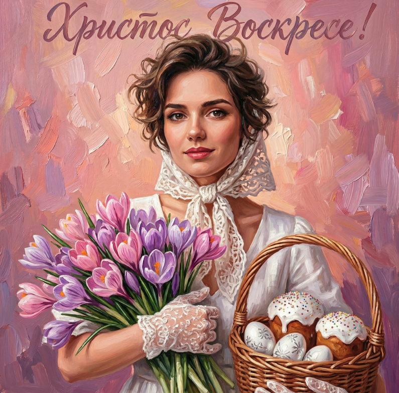 Используй лицо женщины с загруженного фото. Вертикальный кадр 9:16. Гиперреалистичное изображение, стилизованное под масляную живопись с густой рельефной фактурой мазков (heavy impasto brushstrokes). Лицо девушки строго соответствует референсу на 100% — форма лица, карие глаза, нос, губы, брови, мимика без изменений. Девушка 25 лет одета в белое льняное платье, на голове кружевной платок, завязанный спереди, на руках — белые кружевные перчатки. Она обнимает огромный букет розовых и сиреневых крокусов и держит плетёную корзину с белыми пасхальными яйцами, украшенными серебром, и куличами с белой глазурью и посыпкой. Фон тёплый, розово-сиреневый, с выраженными живописными мазками. Освещение мягкое, солнечное, малая глубина резкости создаёт уют и акцентирует лицо, цветы и корзину. В верхней части кадра — каллиграфическая надпись строго на русском языен «Светлой Пасхи!» в тон общей палитре. Качество: ultra detailed, фотореализм с текстурой масляной живописи, высокая детализация тканей, цветов и глазури. Негативный промт: cartoon, anime, 3d, cgi, plastic skin, изменение черт лица, blurry, artifacts, extra fingers, text кроме указанного, watermark, ui, logos.