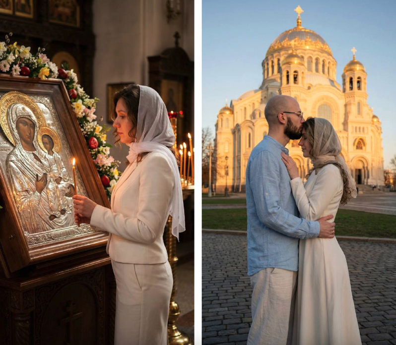 Создай портрет, не меняя черты лица. Кинематографичный снимок влюбленной пары, стоящей на площади перед величественным православным собором с золотыми куполами (ХРАМ ВС РФ). Крупный план кадра по пояс. Мужчина нежно целует женщину в лобо Оба одеты в светлую одежду, мужчина в светлых брюках свободных льняных, и голубой льняной рубашке, женщина в молочном платье длинном с длинным рукавом. Ее волнистые волосы покрывает полупрозрачный платок. Храм ярко подсвечен теплым золотистым светом, контрастирующим. Закатный свет. На земле виден тонкий слой травы, создающий атмосферу ранней весны Высокая детализация лиц, текстуры ткани и архитектуры храма, реализм, 8к. Кадр по пояс