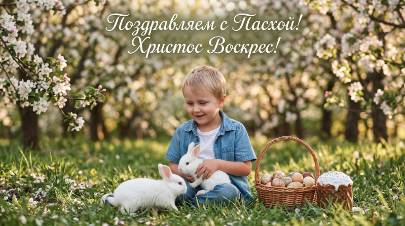 Используй загруженное фото ребёнка и максимально точно сохрани внешность (черты лица, форма лица, глаза, волосы, пропорции 1:1, без искажений и стилизации). Создай реалистичную пасхальную сцену: ребёнок играет в весеннем саду с несколькими пушистыми белыми кроликами. Ребёнок сидит или присел на траве, тянется к кроликам или держит одного из них на руках, естественная поза, живая эмоция (улыбка, интерес). Окружение: цветущий сад, деревья с белыми и розовыми цветами, мягкая зелёная трава, лепестки на земле. Рядом аккуратно стоят пасхальный кулич с белой глазурью и крашеные яйца в корзине. Освещение: мягкий тёплый дневной свет, лёгкие солнечные лучи сквозь деревья, натуральные тени, весенняя атмосфера. Композиция: ребёнок в центре, передний план в фокусе, фон слегка размыт (глубина резкости). Стиль: фотореализм, cinematic photography, высокая детализация кожи, шерсти кроликов и окружающей среды, натуральные цвета, без мультяшности. Добавить сверху аккуратную надпись на русском языке: «Поздравляем с Пасхой! Христос Воскрес!»