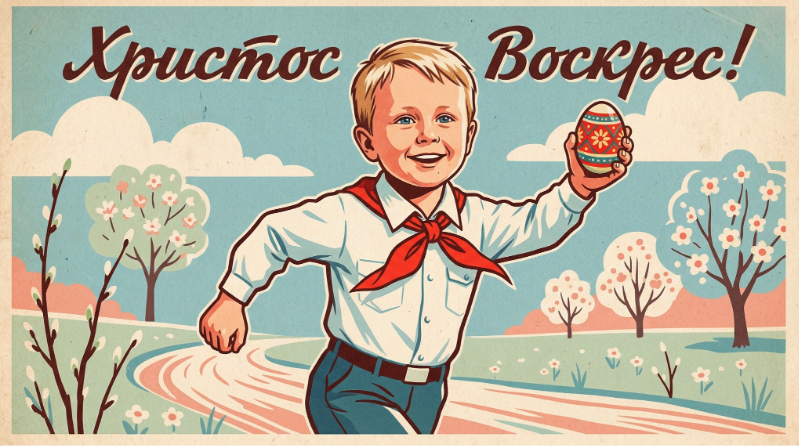 Используй загруженное фото ребёнка и аккуратно перенеси внешность, сохранив узнаваемость (черты лица, пропорции, волосы), адаптируя стиль под советскую иллюстрацию без искажений. Создай пасхальную открытку в стиле советского ретро-плаката середины XX века. Ребёнок в форме пионера (белая рубашка, красный галстук) бежит вперёд с радостным выражением лица, в руке держит ярко окрашенное пасхальное яйцо. Поза динамичная, ощущение движения, радость, энергия. Фон: стилизованный весенний пейзаж — голубое небо, мягкие облака, цветущие деревья, возможно декоративные элементы в духе советской графики. Цветовая палитра ограниченная: красный, бежевый, голубой, пастельные оттенки. Эффект: лёгкая зернистость, текстура старой бумаги, эффект печати. Стиль: советская иллюстрация, плакатная графика, мягкая стилизация, без гиперреализма. Добавить сверху надпись в стиле советской типографики на русском языке: «Христос Воскрес!»