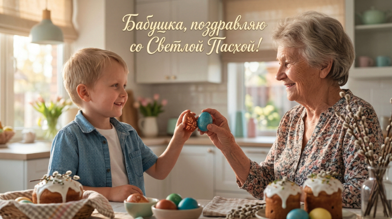 Используй загруженные фото ребёнка и бабушки и максимально точно сохрани их внешность (черты лица, форма лица, глаза, кожа, волосы, пропорции 1:1, без искажений и стилизации). Создай реалистичную пасхальную сцену на красивой светлой кухне. Пространство уютное, современное, с аккуратным интерьером, мягкие пастельные оттенки, чистота и ощущение дома. На столе перед ними — пасхальные куличи с белой глазурью, крашеные яйца, веточки вербы, текстиль, праздничная сервировка. Сцена: ребёнок и бабушка стоят или сидят рядом за столом и участвуют в традиции “биться яйцами”. Они держат яйца в правых руках и в момент касания аккуратно стукают ими друг о друга. Эмоции: живые, настоящие — лёгкая улыбка, радость, тёплый контакт между ними, ощущение семейного момента. Композиция: фокус на руках с яйцами и лицах. ребёнок и бабушка в центре кадра передний план (стол с куличами и яйцами) в фокусе. фон слегка размыт (глубина резкости). Освещение: мягкий тёплый дневной свет из окна, лёгкие солнечные лучи, натуральные тени, красивое свечение на коже и предметах.Цветовая палитра: кремовые, тёплые, пастельные оттенки, натуральные цвета, без пересвета. Стиль: фотореализм, cinematic photography, высокая детализация кожи, текстур еды и предметов, естественные эмоции, без мультяшности.Добавить сверху аккуратную надпись красивым каллиграфическим шрифтом на русском языке: «Бабушка, поздравляю со Светлой Пасхой!»