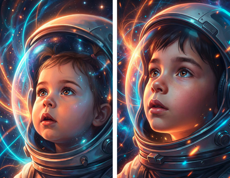 Цифровая иллюстрация. Ребёнок-космонавт в шлеме смотрит вверх с восторгом. Лицо освещено мягким светом, глаза сияют. Фон: абстрактный космос, световые линии, энергия, частицы. Сохранить 100% узнаваемость: черты лица, возраст, пол, тон кожи, прическа, брови, форма носа, губ, глаз, челюсти, цвет волос. Без эффекта пластика, высокая детализация кожи, волос. Строго анатомически корректные пропорции без искажений. Стиль: digital painting, semi-realistic. Цвета: насыщенные оранжевый, синий, неоновый свет. Освещение: контрастное, с подсветкой по контуру шлема. Детализация высокая, но художественная. Атмосфера: мечта, вдохновение, космическая фантазия. illustration, vibrant colors, cinematic art