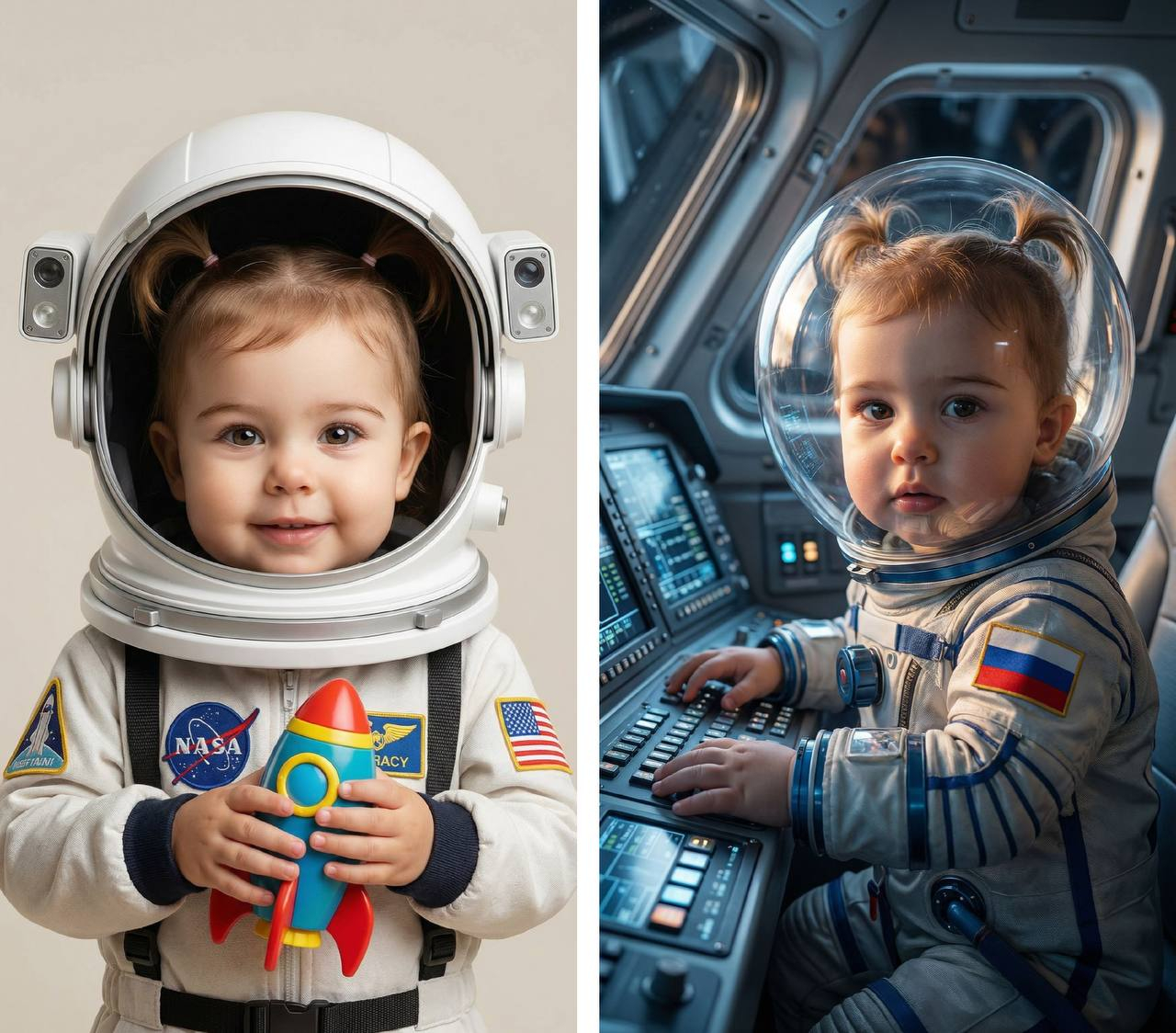 Фотореалистичный кадр. Ребёнок в скафандре сидит в кабине космического корабля. Сохранить 100% узнаваемость: черты лица, возраст, пол, тон кожи, прическа, брови, форма носа, губ, глаз, челюсти, цвет волос. Без эффекта пластика, высокая детализация кожи, волос. Строго анатомически корректные пропорции без искажений. Руки на панели управления, вокруг множество кнопок и экранов. Смотрит в камеру. Шлем прозрачный, хорошо видно лицо. На скафандре один шеврон флага России, без других надписей. Освещение: холодный технологичный свет от приборов + мягкий фронтальный свет на лицо. Фон: кабина корабля, слегка размыта. Стиль: cinematic realism, high detail, 8k. Текстура: металл, стекло, ткань максимально реалистично. Фокус на лице, глаза чёткие. photorealistic, ultra detailed, cinematic lighting