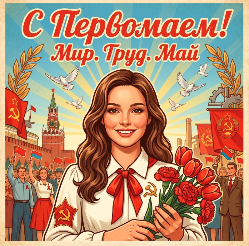Есть и практичная причина: ретро-стиль хорошо смотрится в соцсетях. Открытка через нейросеть получается не шаблонной, а личной — можно сделать открытку с Первомаем со своим фото, добавить советский плакатный стиль, тюльпаны, лозунг «Мир. Труд. Май» и адаптировать картинку под пост, сторис или поздравление для родителей и коллег.