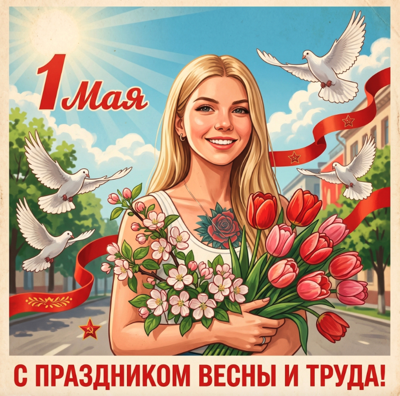 Необычный способ поздравить с Первомаем — сделать персональную ИИ открытку на Первомай. Например, превратить своё фото в советскую открытку с тюльпанами, голубями, красными флагами и надписью «Мир. Труд. Май».