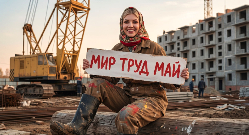 Фотореалистичное изображение женщины в стиле советского плаката 1960-х годов, но с современным качеством (8K). Персонаж: Девушка сидит на деревянном бревне на строительной площадке. Она широко и искренне улыбается, глядя в камеру. На голове у неё традиционный русский цветастый платок (с красным кантом и цветами), завязанный под подбородком. Одежда: Она одета в грубую рабочую спецодежду (коричневая роба или комбинезон), которая выглядит поношенной и запачканной пятнами краски. На ногах - высокие чёрные резиновые сапоги. Действие: В руках она держит белый прямоугольный плакат с неровными краями. На плакате красной краской написано на русском языкее: «МИР ТРУД МАЙ». Фон: За ней виден активный строительный процесс. Слева возвышается жёлтый башенный кран, справа - строящиеся серые панельные многоэтажки. Освещение и атмосфера: Тёплый свет заходящего солнца (золотой час), создающий ностальгическую и позитивную атмосферу праздника Весны и Труда. Стиль соцреализма, высокая детализация.