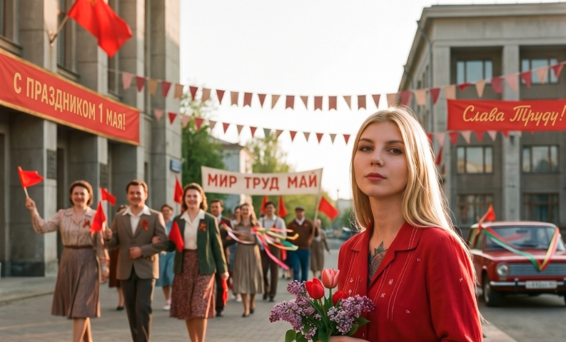 Да, можно сделать фото Первомай в стиле СССР. Загрузите своё фото и попросите нейросеть перенести человека в атмосферу первомайской демонстрации: площадь, флаги, транспаранты, цветы, голубое небо и лёгкая плёночная обработка. Такой вариант подойдёт и для фотосессии на 1 мая.