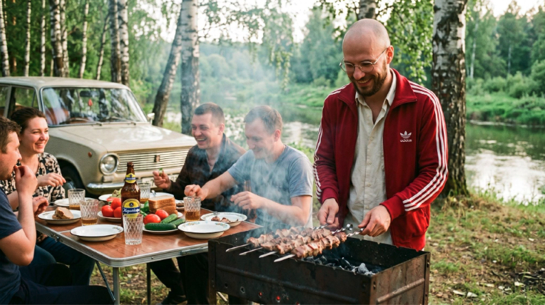 Советский пикник на природе, шашлыки в стиле СССР, лето, теплая ностальгическая атмосфера. На переднем плане — шампуры с сочным шашлыком на старом металлическом мангале, угли тлеют, легкий дым поднимается вверх. Вокруг — простая компания людей в советской одежде: спортивные костюмы, рубашки, кепки. На складном столе — классические атрибуты: гранёные стаканы, бутылка “Жигулёвского”, хлеб, огурцы, помидоры, эмалированные тарелки. Фон — природа: берёзы, река или дача, возможно старые “Жигули” или “Нива” припаркованы рядом. Свет мягкий, как на пленочной камере, слегка выцветшие цвета, эффект старой фотографии. Атмосфера дружбы, простоты и уюта. Стиль: soviet aesthetic, retro photography, film grain, warm tones, natural light, 35mm film, nostalgic mood, high detail, realistic