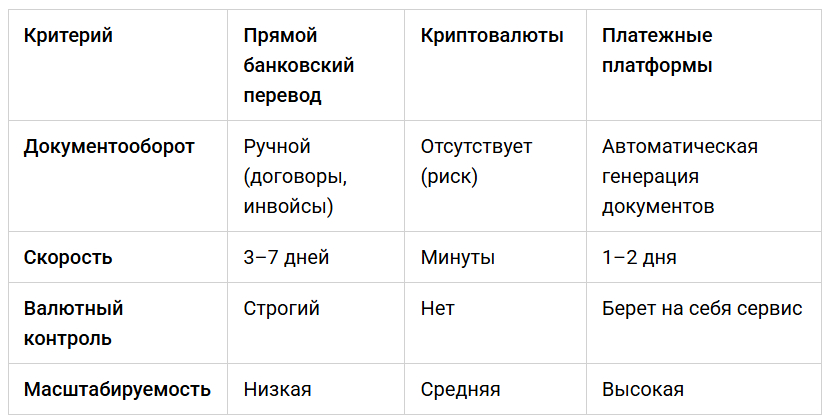 Чтобы выбрать подходящий инструмент, необходимо оценить его по четырем критическим параметрам: автоматизация документации, скорость зачисления, география покрытия и прозрачность затрат.