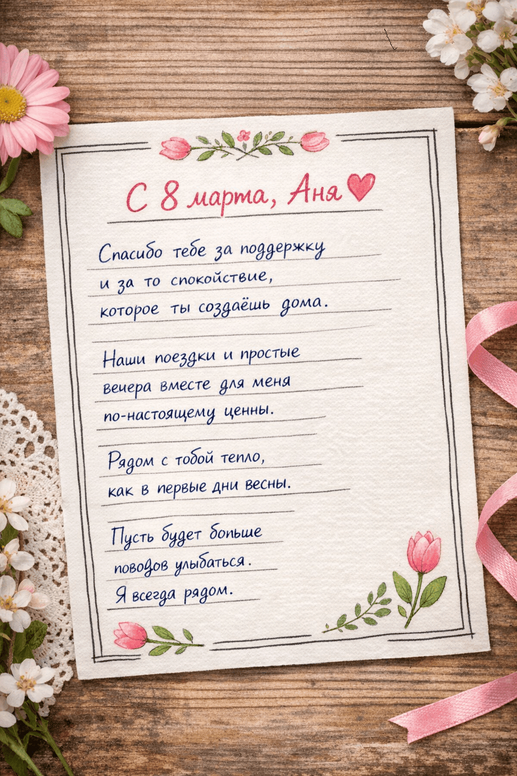 Напиши короткое поздравление с 8 марта для жены Анны. Объём 5 предложений, до 90 слов. Тон искренний, спокойный, без громких эпитетов и шаблонов. Упомяни благодарность за поддержку, совместные поездки и уют дома. Добавь один образ весны, но без банальных фраз типа «цвети и сияй». Сделай текст естественным, чтобы он звучал как личное сообщение, а не открытка из интернета.