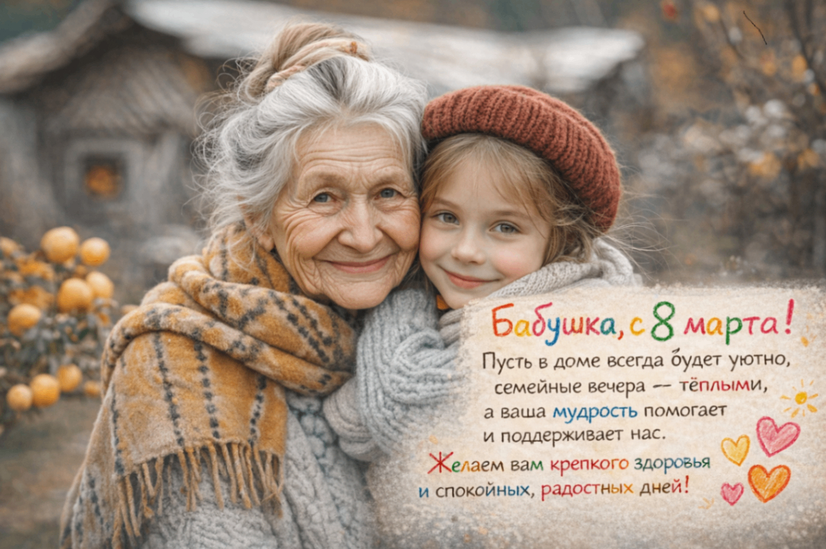 Напиши короткое поздравление с 8 марта для бабушки. 5 предложений. Упомяни домашний уют, семейные вечера и её мудрость. Тон мягкий и уважительный. Добавь пожелание крепкого здоровья и спокойных радостных дней. Без излишней патетики и слишком сложных слов.