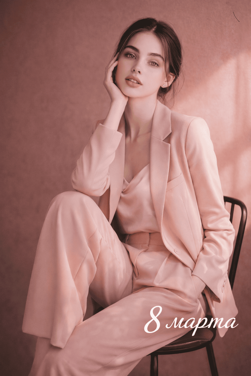 «Создай фотографию женщины в пастельно-розовых оттенках студии на барном стуле. Возьми за основу лицо девушки, изображенной на загруженном снимке. Она одета в пастельно-розовый элегантный костюм — пиджак и широкие брюки. Под пиджаком — атласная блуза нежного розового оттенка. Волосы аккуратно уложены. Она сидит на высоком барном стуле на фоне темно-розовой стены с мягким природным светом, создающим четкие тени и теплую атмосферу. Позирует, подняв руку к лицу. Фон — темно-розовая матовая стена с едва заметной текстурой, как у декоративной штукатурки. Освещение — естественный дневной свет из окна слева — мягкий, но четкий. Цветовая гамма — пастельные и глубокие розовые тона, теплая, гармоничная. Стиль — фотореализм, акцент на игре света и тени, высокой детализации ткани, волос и кожи»