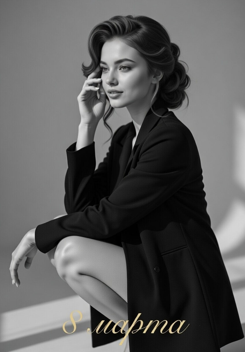 «Создай монохромную фотографию женщины в моменте тихой задумчивости. Возьми за основу лицо девушки, изображенной на загруженном снимке. Она сидит на корточках, полуоборотом в профиль. Одна рука опирается на колено — локоть согнут, ладонь расслаблена. Другая рука у лица: пальцы слегка касаются виска, подбородок чуть приподнят. На ней — черный удлиненный пиджак демисезонного стиля из матовой ткани. Фон — нейтральный, светло-серый, с деликатными тенями. Черно-белое изображение. Освещение — мягкий контрастный свет (источник слева спереди), тени длинные, но не резкие. Стиль — фотореализм с легкой художественной обработкой, акцент на игре света и тени, пластике позы, текстуре волос и ткани»