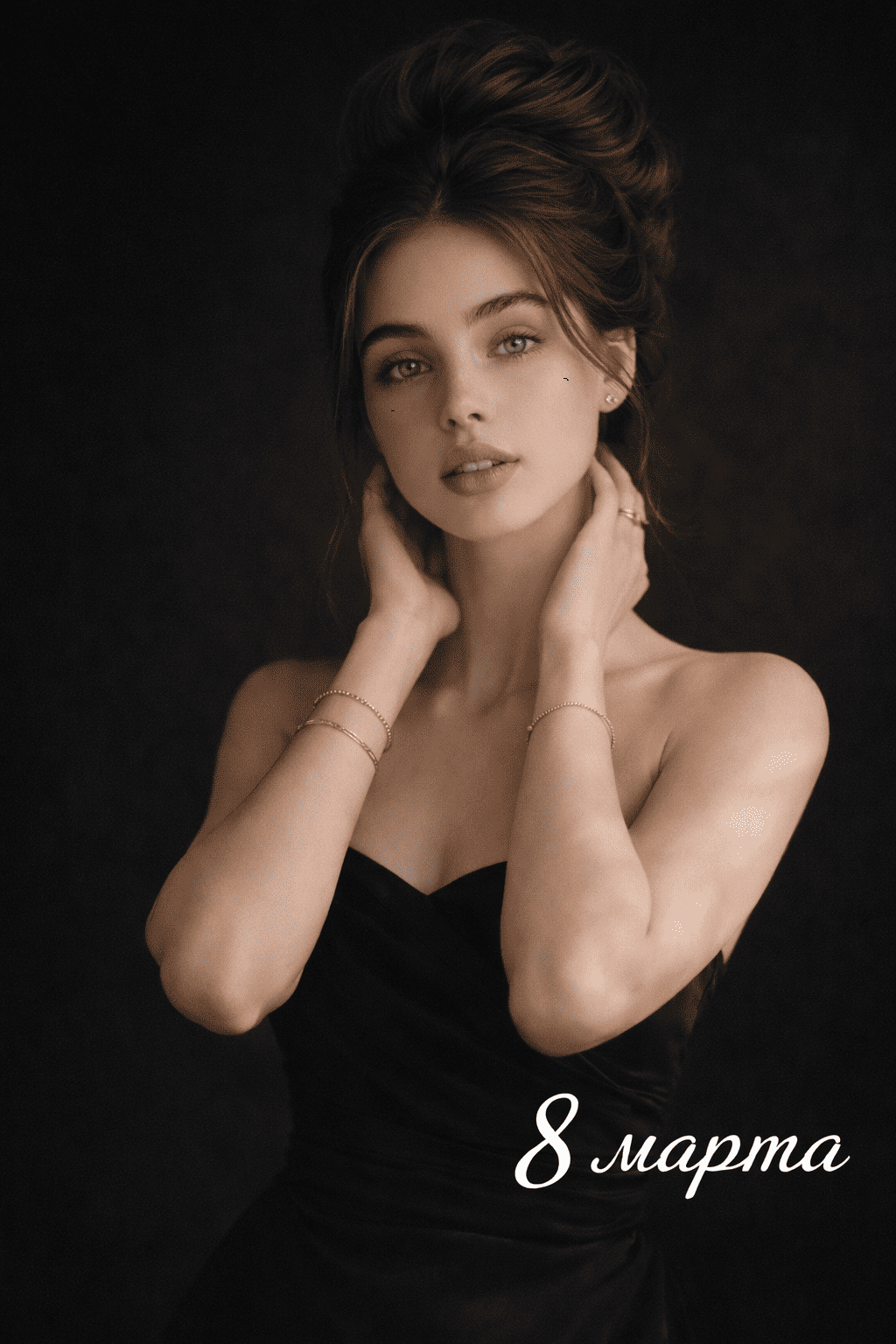 «Создай фотографию женщины в изысканном черном платье без бретелек. Возьми за основу лицо девушки, изображенной на загруженном снимке. Она стоит в полутьме, но мягкий свет выделяет ее фигуру. На ней — элегантное черное платье без бретелек. Легкая струящаяся ткань мягко облегает плечи и спину. Ее волосы свободно ниспадают, руки аккуратно подняты к шее. На запястьях — тонкие золотые браслеты, на пальцах — изящные кольца. Металл мягко мерцает в рассеянном свете. Фон — глубокий темный, однотонный. Освещение — мягкое, рассеянное. Стиль — фотореализм, максимальная детализация: отдельные пряди волос, блики на золоте, складки ткани»