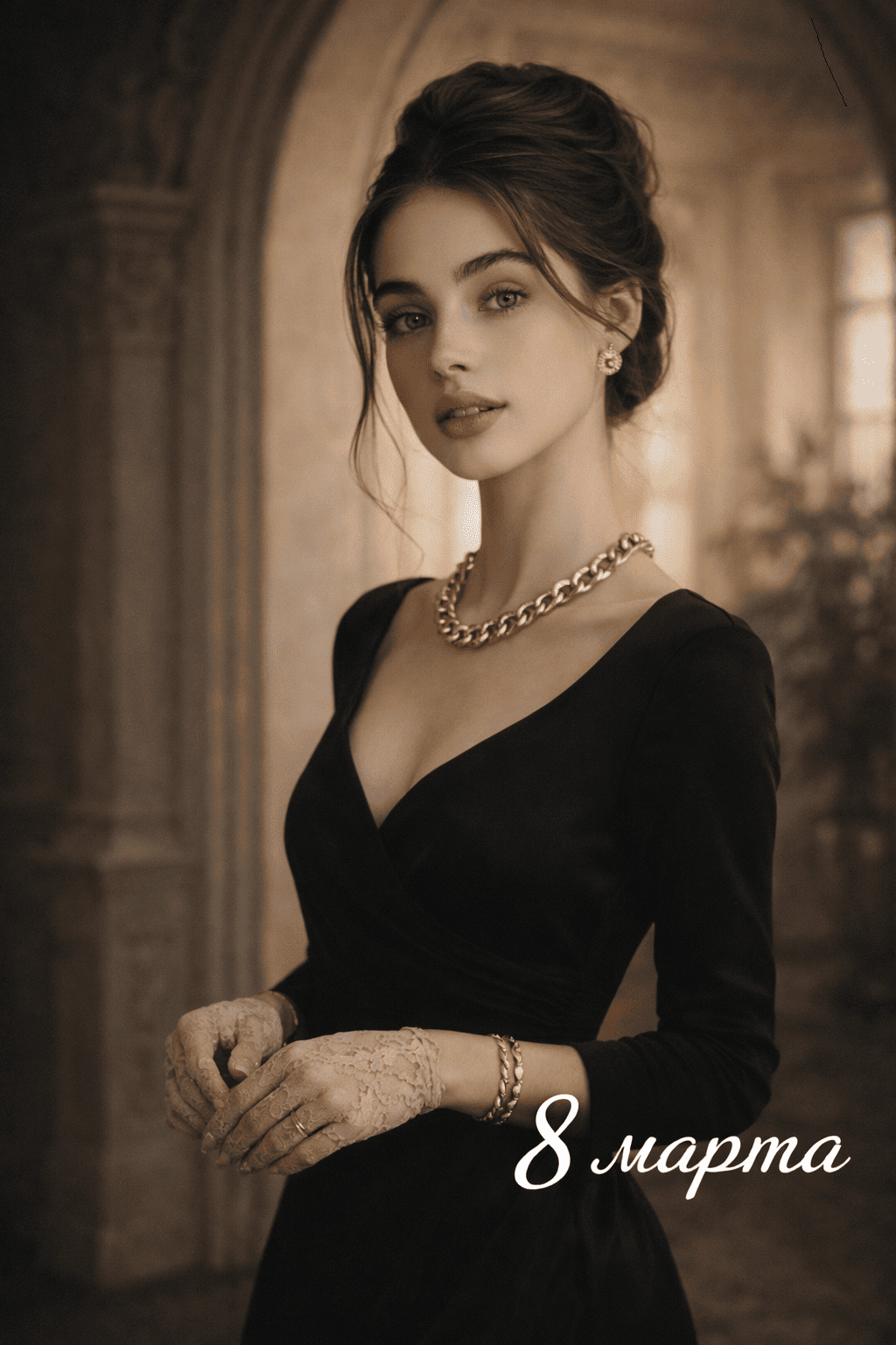 «Создай фотографию женщины в стиле Old Money. Возьми за основу лицо девушки, изображенной на загруженном снимке. Она стоит у арки старинного особняка, слегка повернувшись в профиль. На ней — элегантное темное платье с V-образным вырезом и длинным рукавом, плотный шелк мягко облегает фигуру. Волосы аккуратно уложены. Крупное золотое ожерелье и серьги в тон притягивают взгляд. Фон — изящный интерьер: светлая стена с лепниной, арка с декоративной отделкой, несколько крупных растений в керамических горшках, размыт. Освещение — приглушенный свет проникает через высокие окна и создает мягкие тени. Цветовая гамма — глубокий черный и теплый золотой на фоне светлых тонов интерьера. Стиль — фотореализм, фокус резкий на лице, верхней части тела и украшениях»